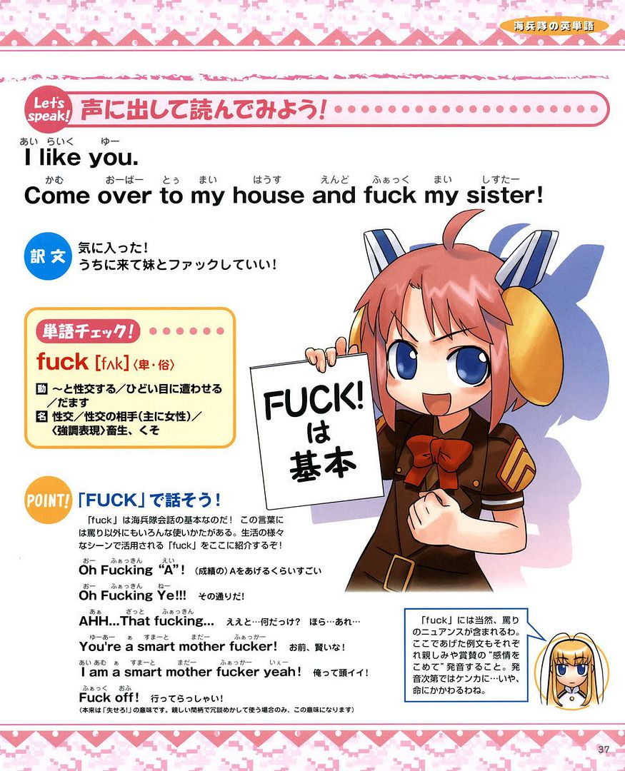 I'm just quoting this hilarious Japanese "let's learn English" type book that sources all its examples from Full Metal Jacket. My sister moved out years ago. :P